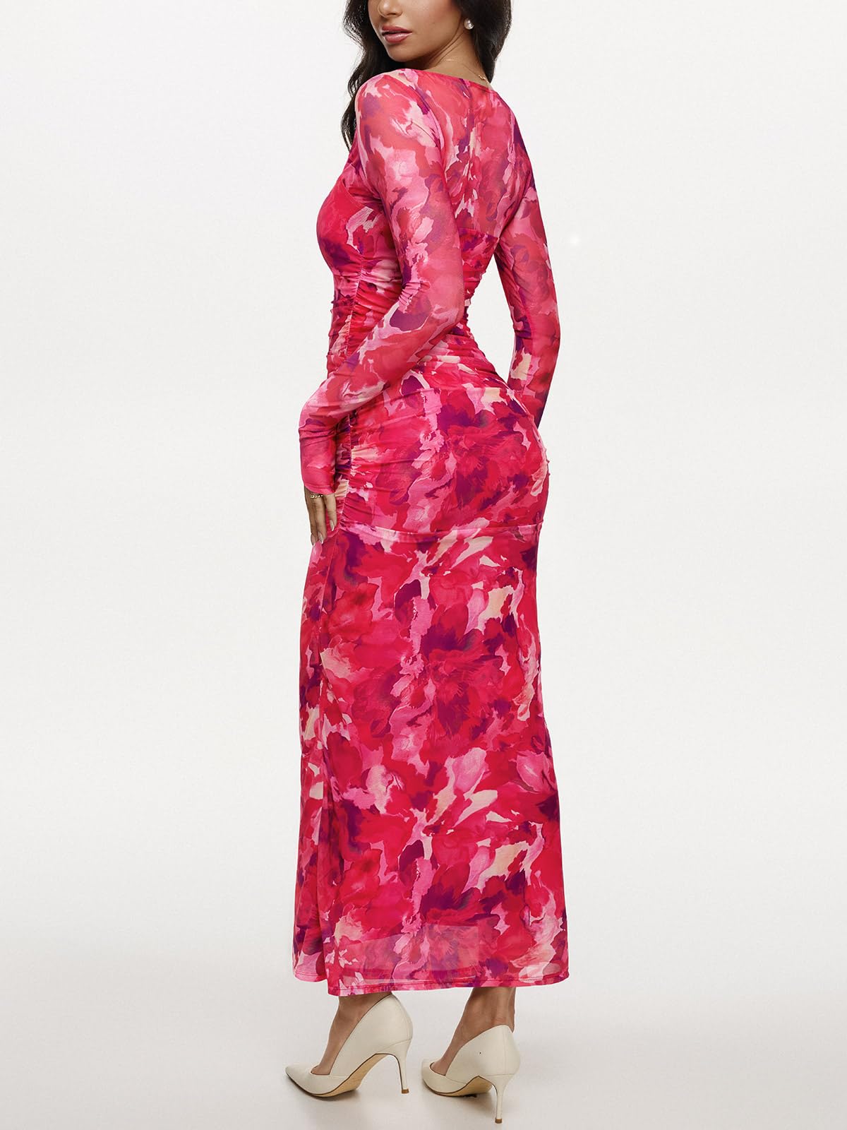 REORIA Long Sleeve Wedding Guest Maxi Dresses for Women Sheer Mesh Square Neck Ruched Bodycon Long Dress 2025 Fall Outfits * #sponsored