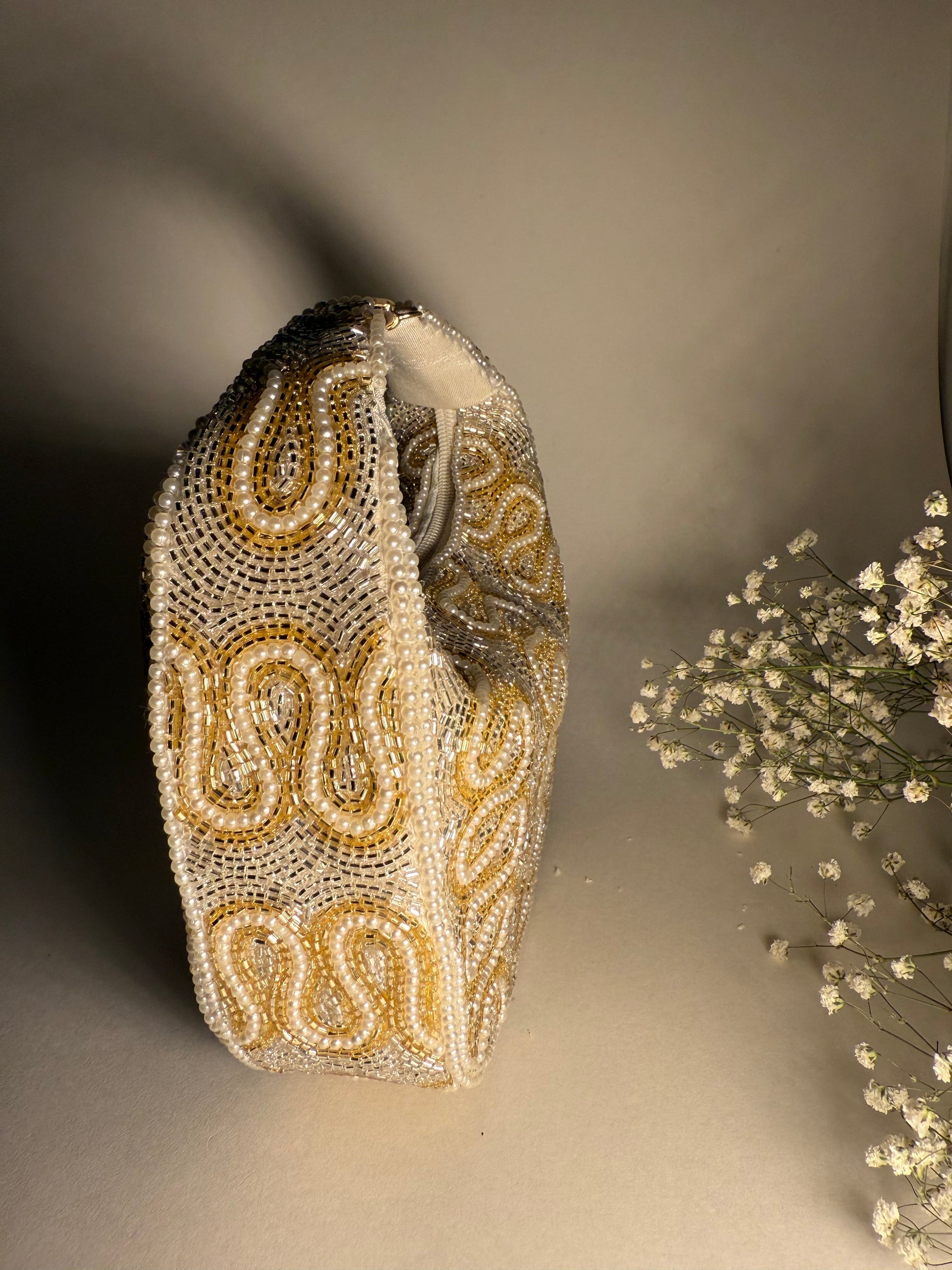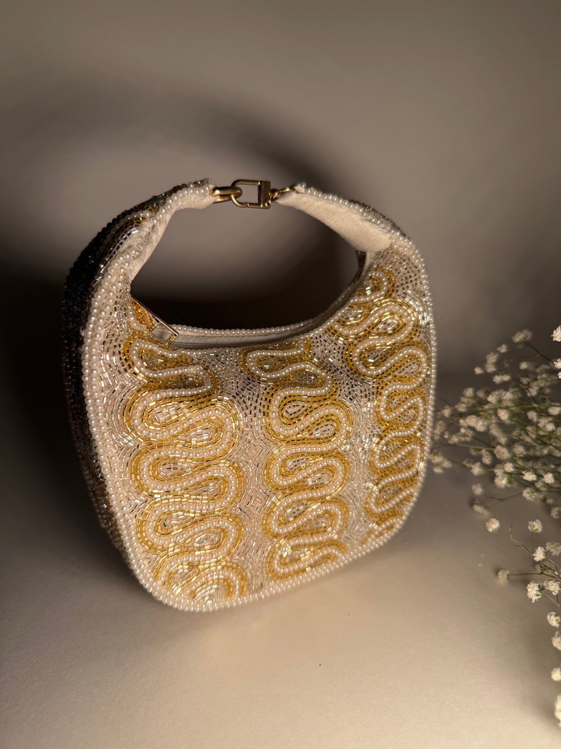 A true masterpiece of craftsmanship, The Ivory Opulence Bag is designed for those who appreciate luxury in every detail. Hand-embellished with intricate pearl and gold beadwork, this structured bag exudes timeless elegance. The swirling patterns of beads and pearls create a mesmerizing texture, making it a statement piece that effortlessly elevates any ensemble.
