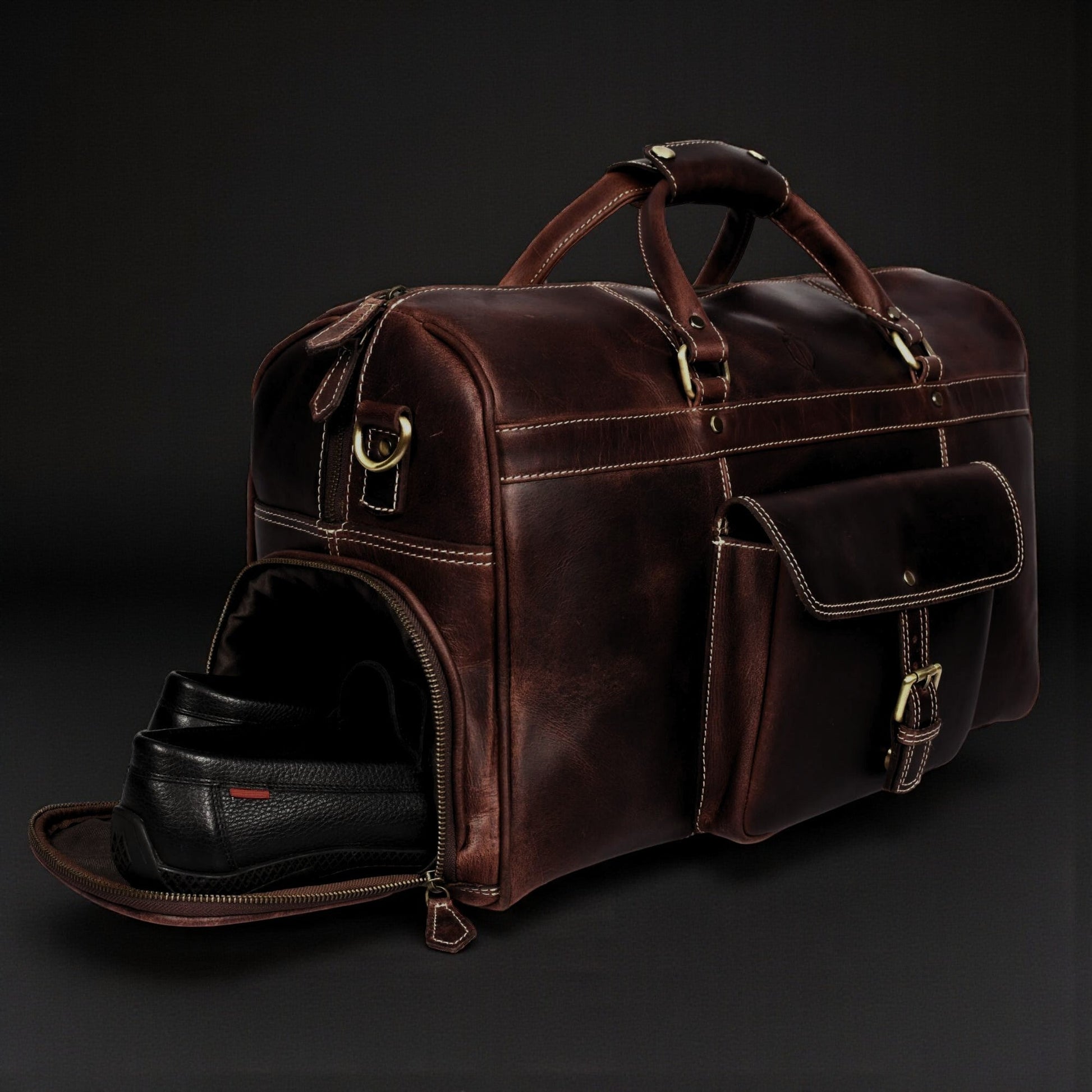 Crafted from premium distressed full-grain leather, the Voyager Duffle serves as the ultimate travel companion, enhancing your travel experiences and organizing your adventures.
